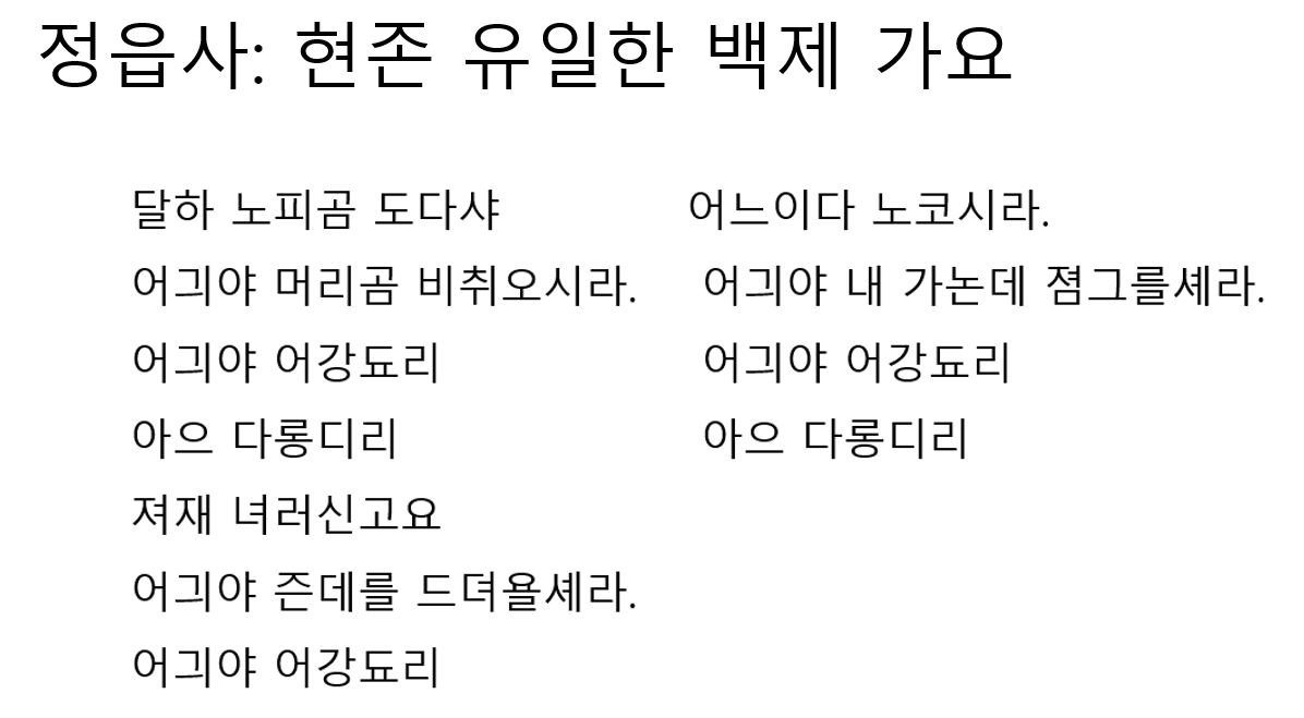 <참고> ‘정읍사’는 여음을 빼고 사설 대목만 들어 보면 전체 3행의 구성에 각 행별 4음보를 이루면서 평시조의 3장 6구와 비슷한 형태를 이루고 있다는 것을 알 수 있다. 이것은 이러한 형식이 우리 노래의 기본형 중 하나이고, 오랫동안 전승되어 왔으며 백제의 노래가 고려초에 시작된 시조와 흡사했다는 것을 짐작하게 한다.