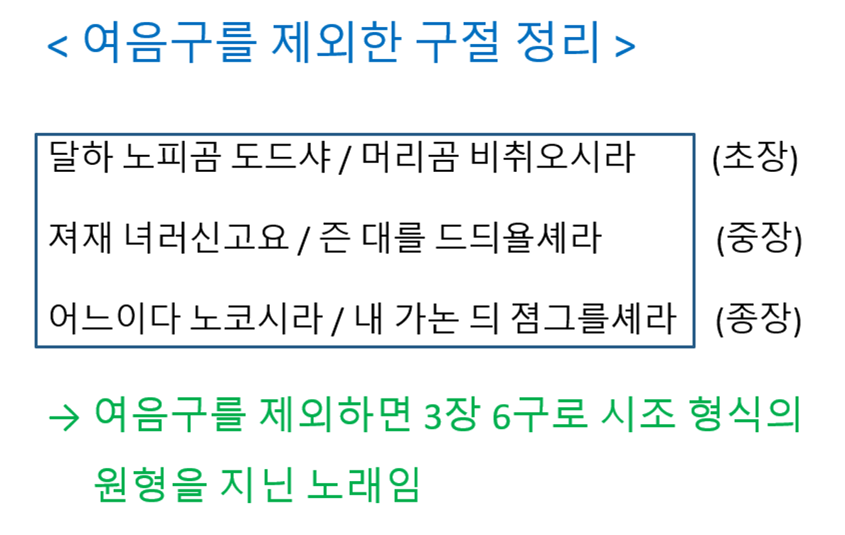결론을 말씀드리면, 향가의 3단 구성과 낙구(9행의 첫 단어가 감탄사)가 시조의 3장 구성과 종장의 첫 음보의 감탄사 활용이 영향 관계에 있다는 점을 발견해야 합니다.