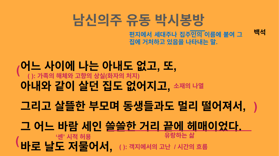 창비교육 공통국어2에 실린 이 작품은 가난하고 무기력한 지식인인 시적 화자가 '남신의주'라는 낯선 공간에서 느끼는 외로움과 절망감, 그리고 가족에 대한 그리움을 담담하게 고백하며, 이러한 절망적 현실 속에서도 그것을 운명으로 받아들이고 더 나아가 현실을 극복하려는 의지를 드러내는 작품입니다.