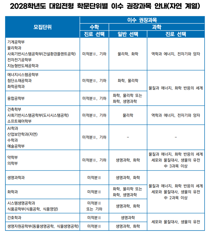 지난 8월 29일 중앙대에서 2028학년도 대학입학전형에서 권장하는 학문단위별 이수 권장 과목이 공개되었습니다.