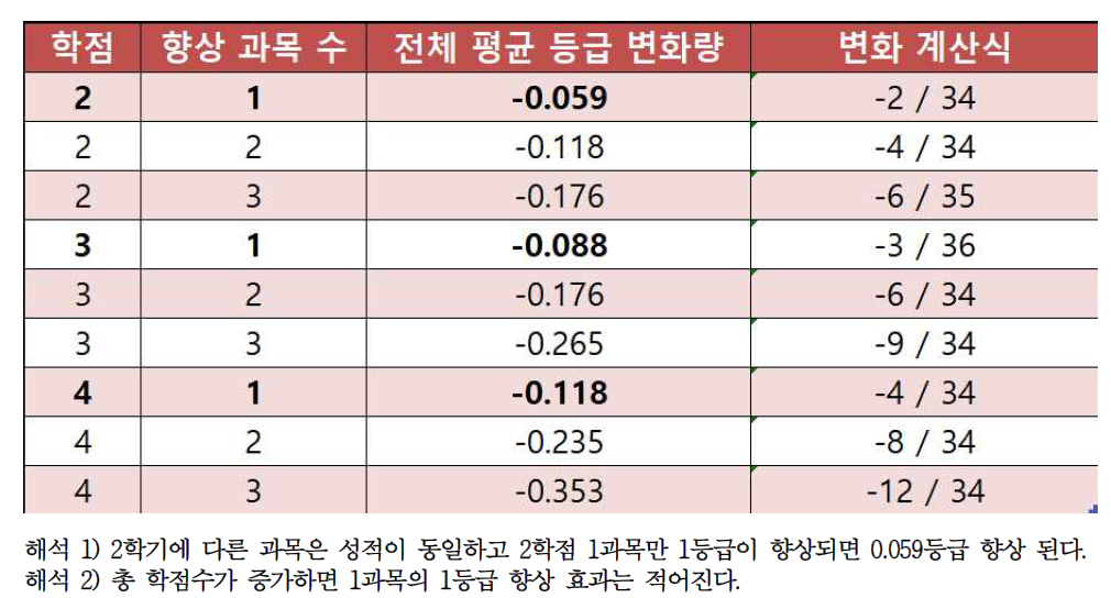 한 과목에서 단 1등급만 향상되었을 때, 그 과목의 단위수에 따라 전체 평균등급이 어떻게 변화하는지 나타낸 표입니다. 부산광역시교육청의 5등급제 내신 평균 누적비율 데이터와 가장 잘 연결되는 모델입니다.