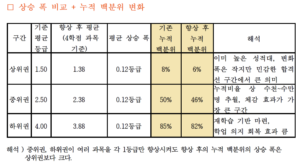 단 한 과목, 단 1등급의 변화만으로도 전체 평균은 달라지고, 누적 백분위는 수천에서 수만 명을 앞지르게 됩니다.
